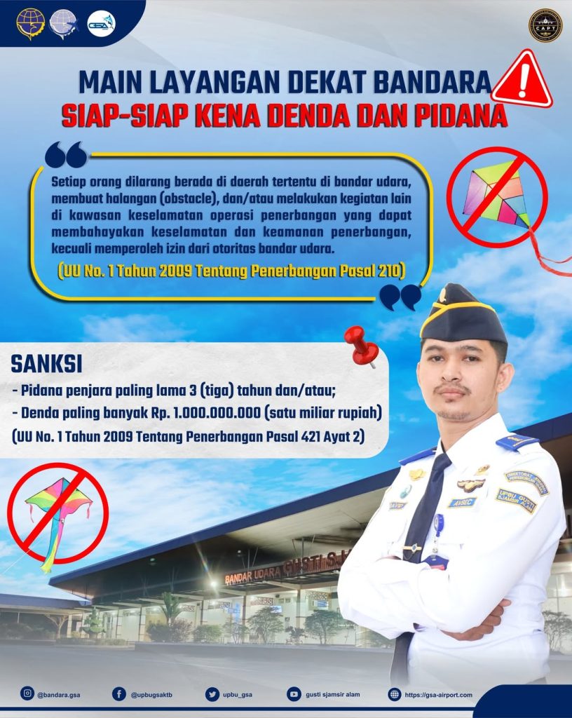 Jadi kalau #SobatGSA & #SobatAviasi masih nekat main layangan di area sekitar bandara, siap-siap kena sanksi berat ya 😬